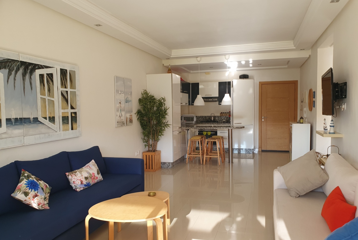 Appartement en rez-de-jardin d’une superficie de 81 m2 situé à Sidi Rahal, à 40 km de Casablanca, dans une résidence fermée et sécurisée avec jardins et piscines.