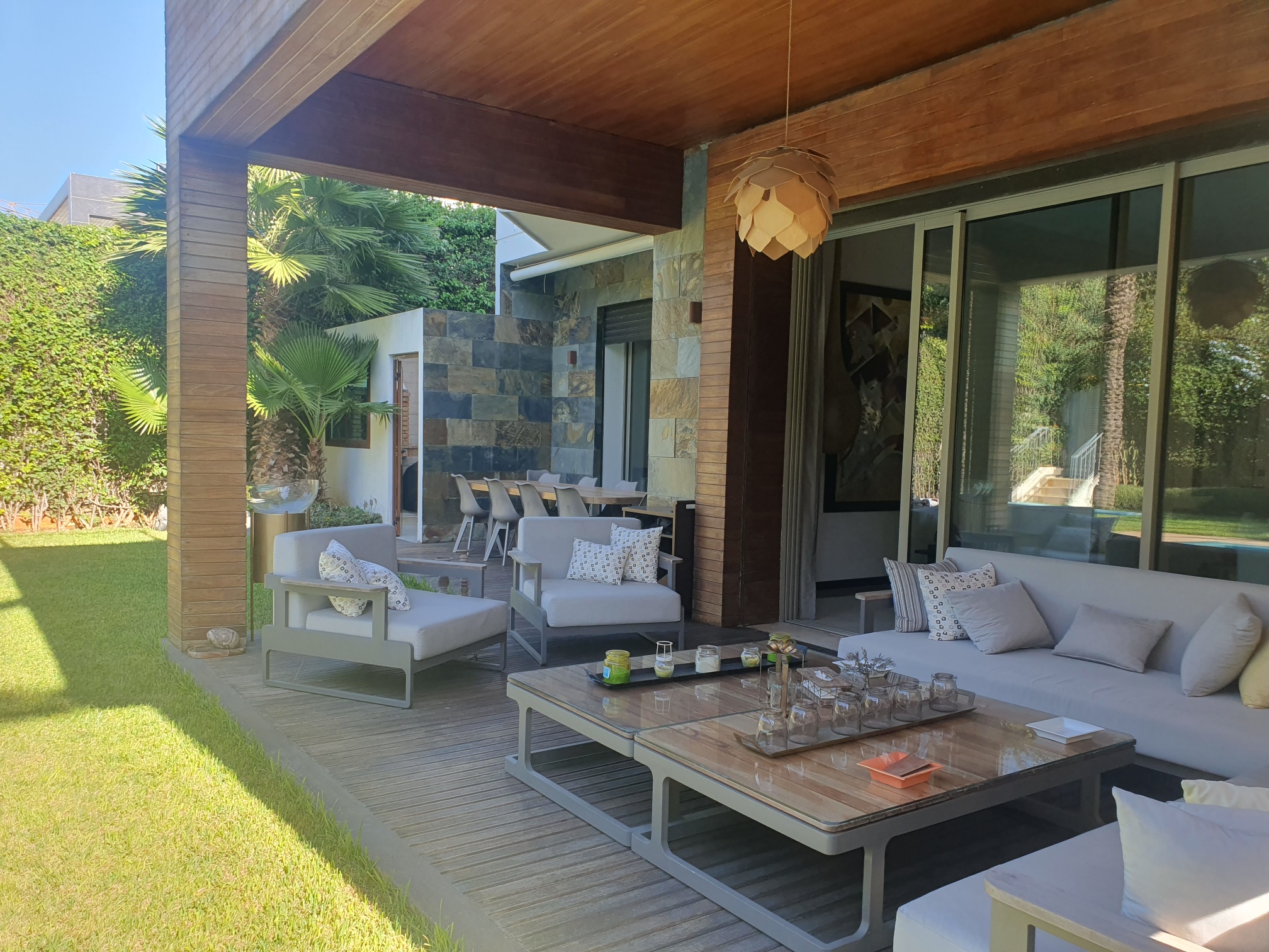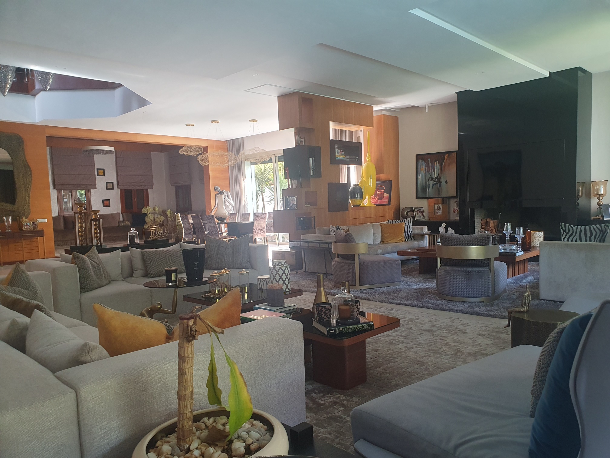 – une grande réception avec plusieurs salons, cheminée, accès sur le jardin et la piscine